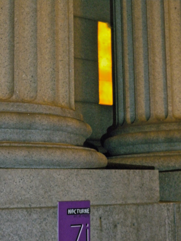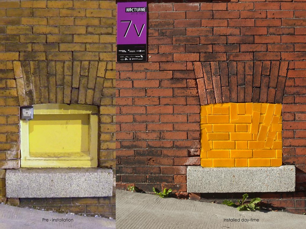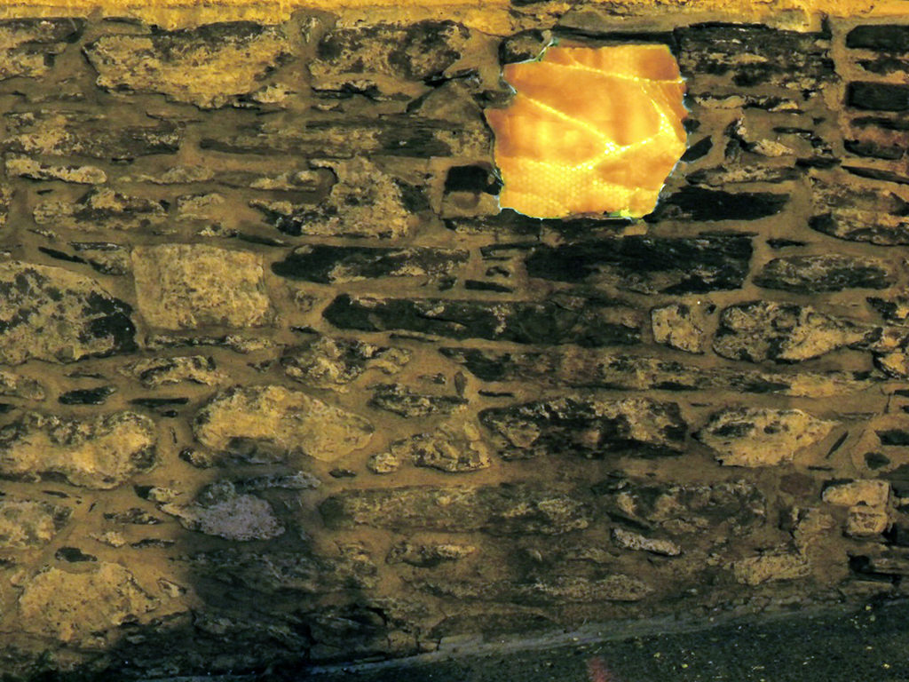 This project brought to light the small overlooked niches set into buildings in six small installations for Nocturne 2012 viewers, as they wandered the downtown core. Each one was filled with a glowing light and a translucent cover, the surface of each installation mimicking the texture of the wall surrounding it. Upon closer inspection, the cover is made from beeswax and the glow that emanates has a honeycomb pattern from within.