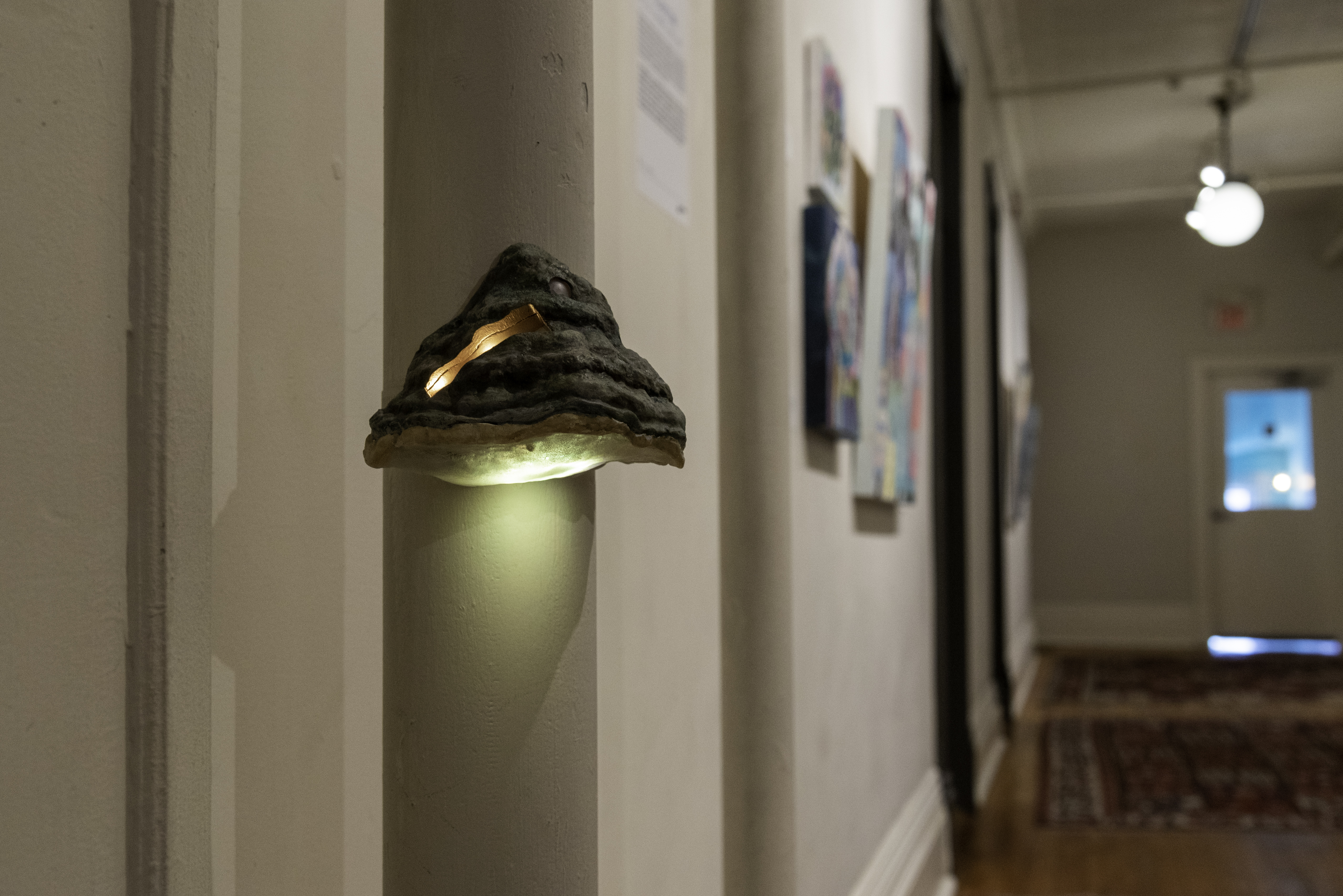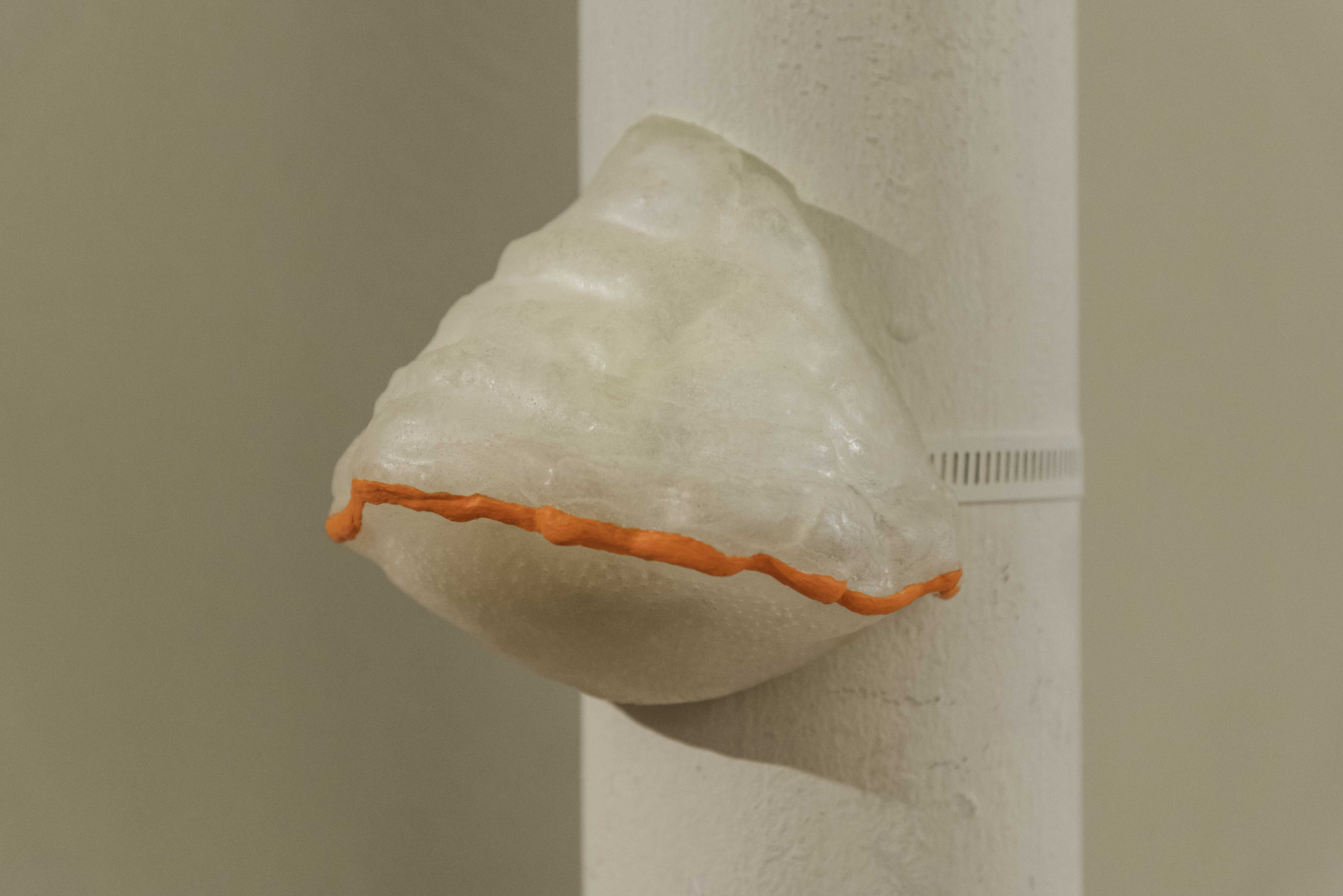 The weather is the atmospheric condition of time and place; it produces new ecologies in collaboration with the local organisms. Located on the birch-like pipe with the distinct function of “breathing” the air outside, this work speculates on what fungi might produce in a climate of dissent against environmental changes they are experiencing, and imagines ethnologist Jakob von Uexküll’s, Umwelt for bracket fungi in which only certain, salient aspects of the environment are available to ascertain.