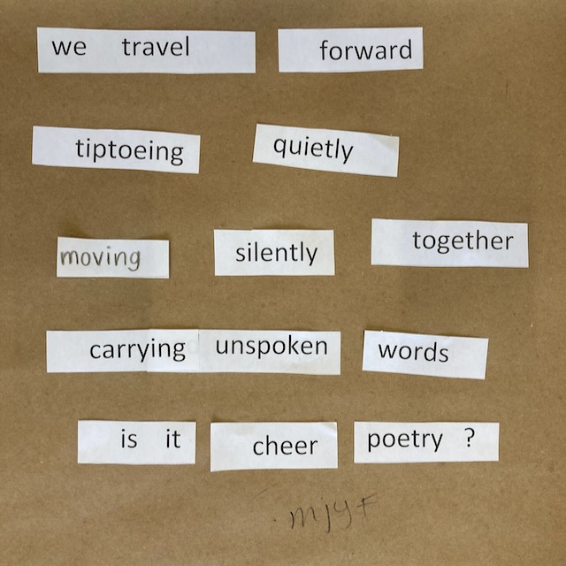 We move with phrases: tiptoeing quietly together/we/travel/forward/carrying words/moving and unspoken/is it poetry/ ?/ *crickets/cheer silently/