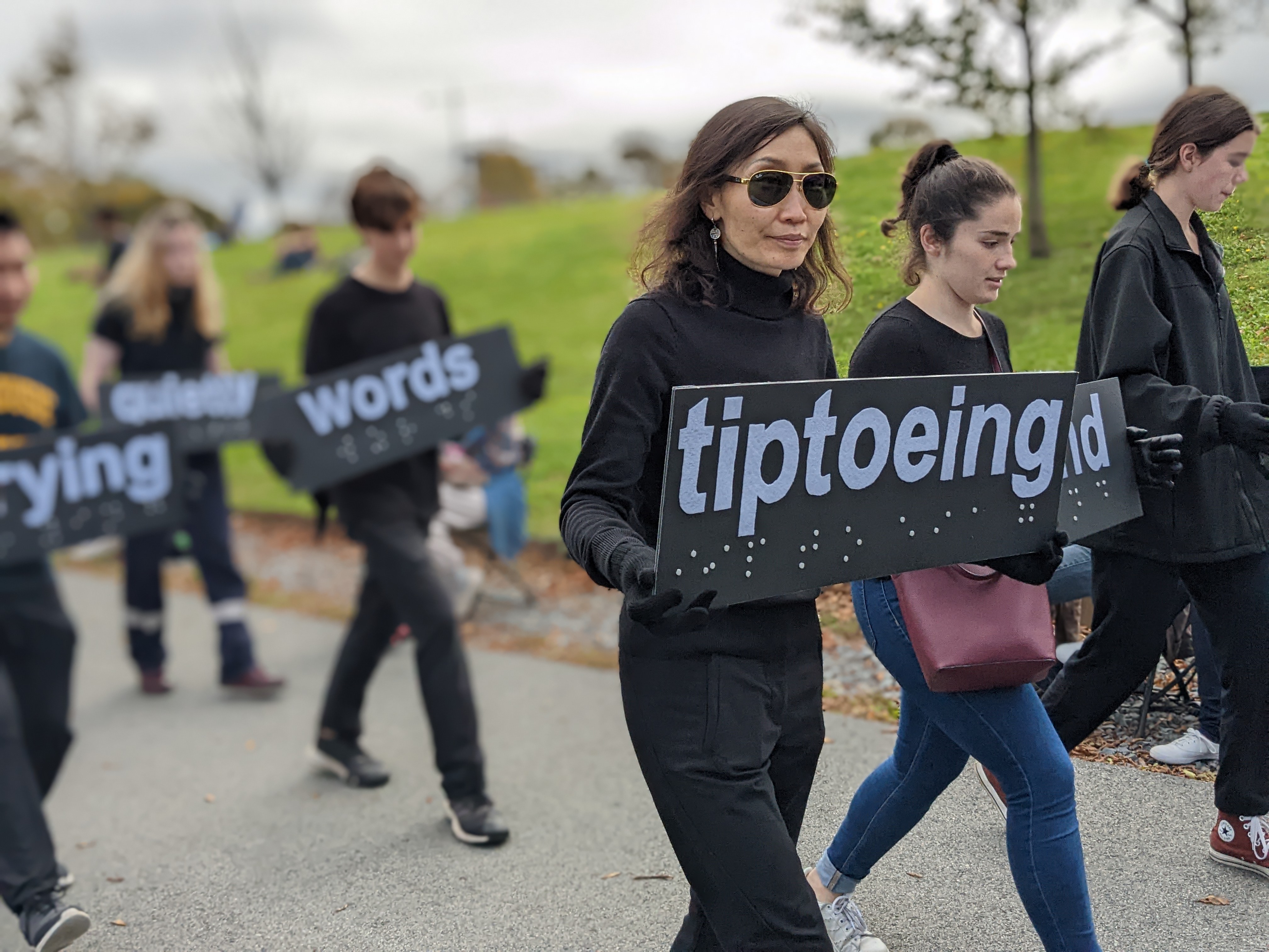 “Poetry on Tiptoes” is a performance of text that has been written and fabricated collaboratively, whereby each participant quietly tiptoes along while carrying a word or two. The text is a self referential poetic visual description that is choreographically malleable – allowing revisions en route as the participants tiptoe along in lines that shift and revert as the parade proceeds.