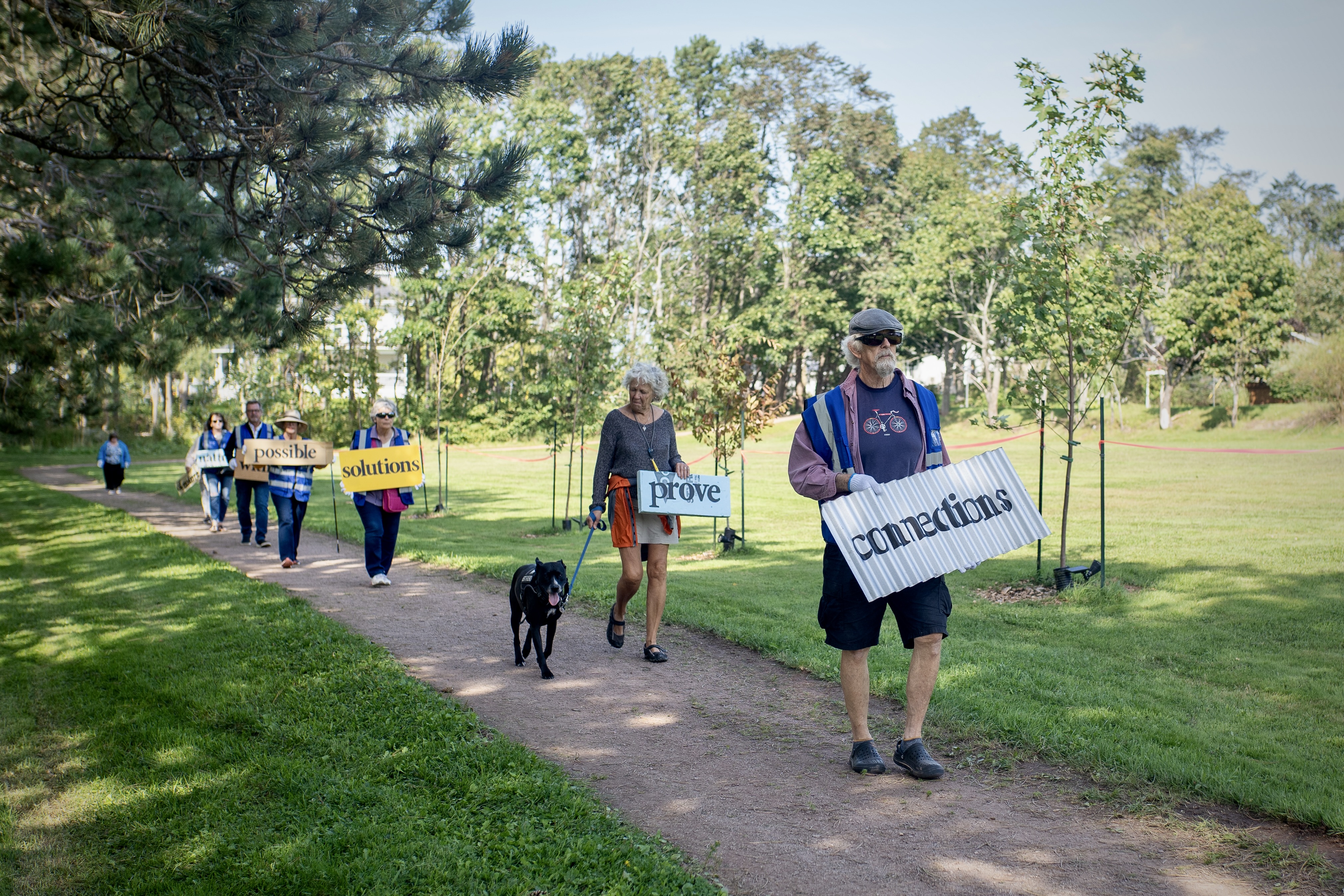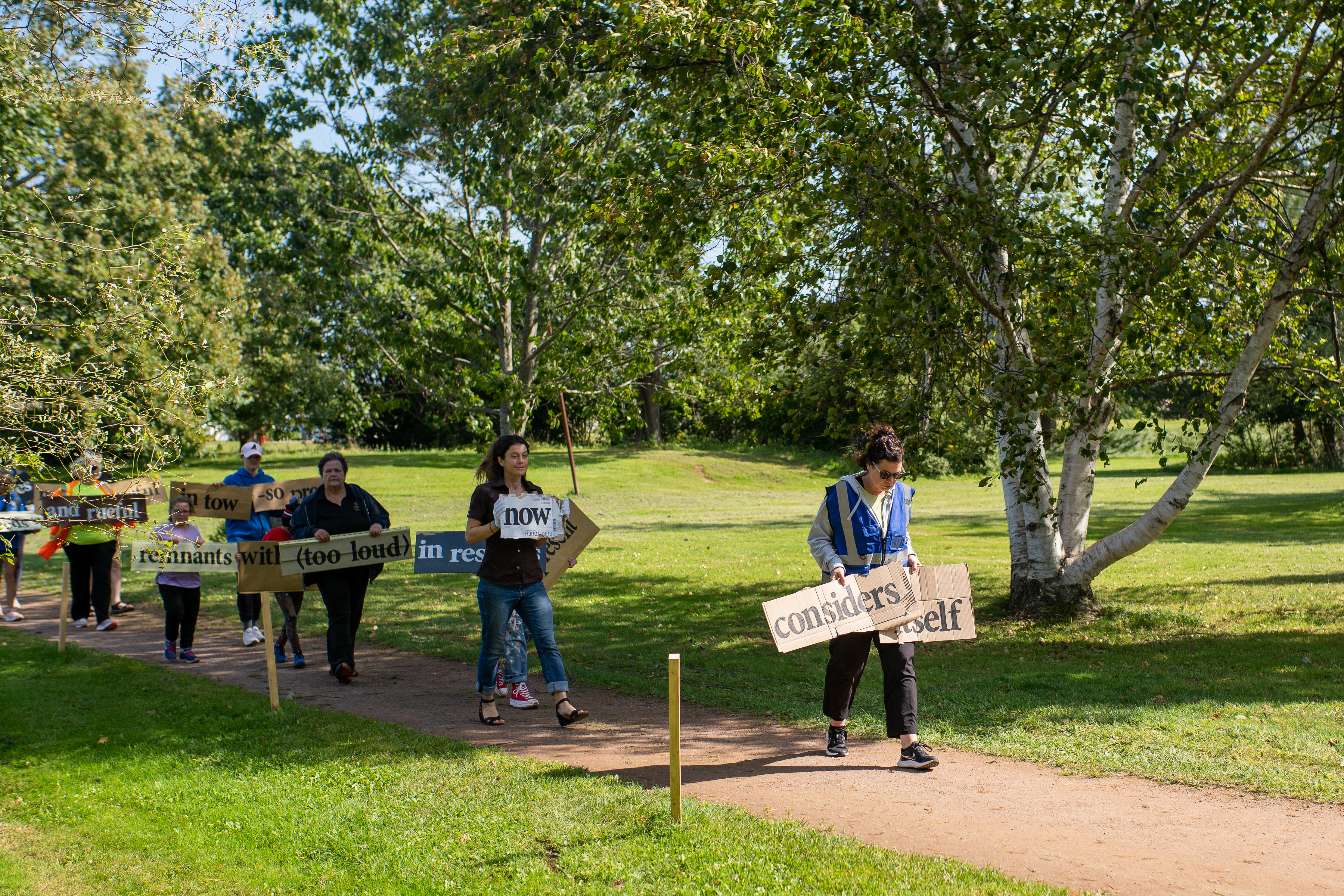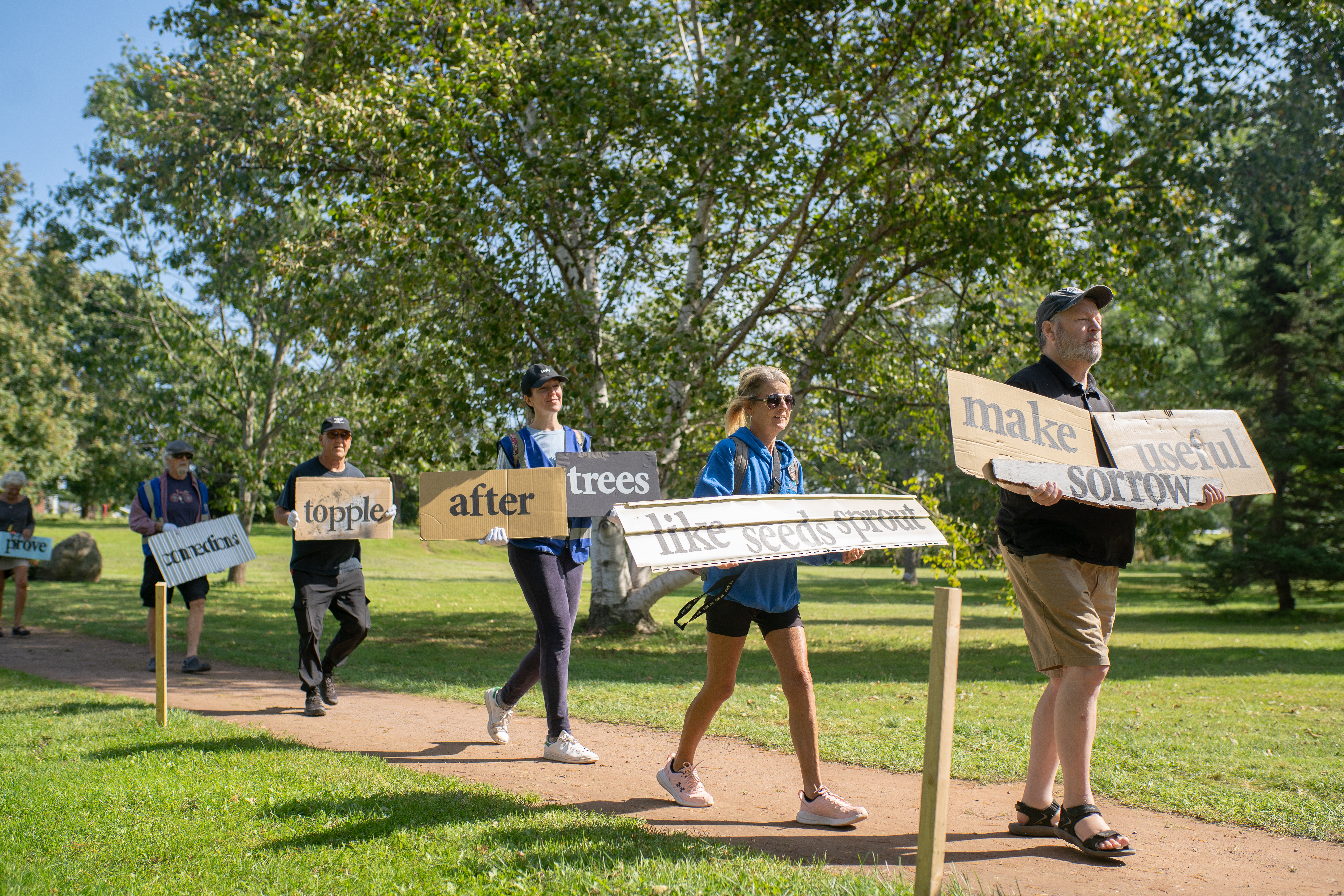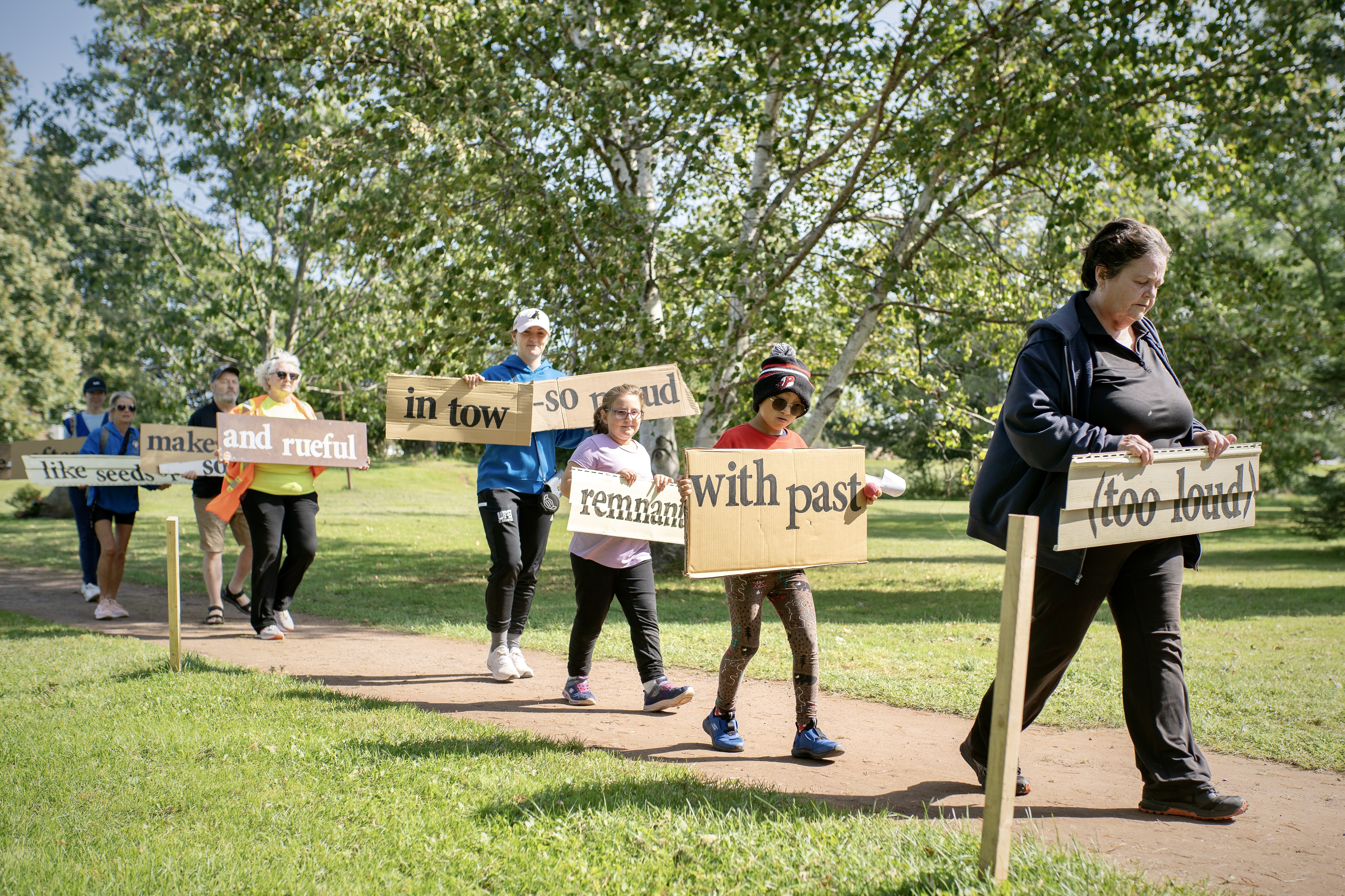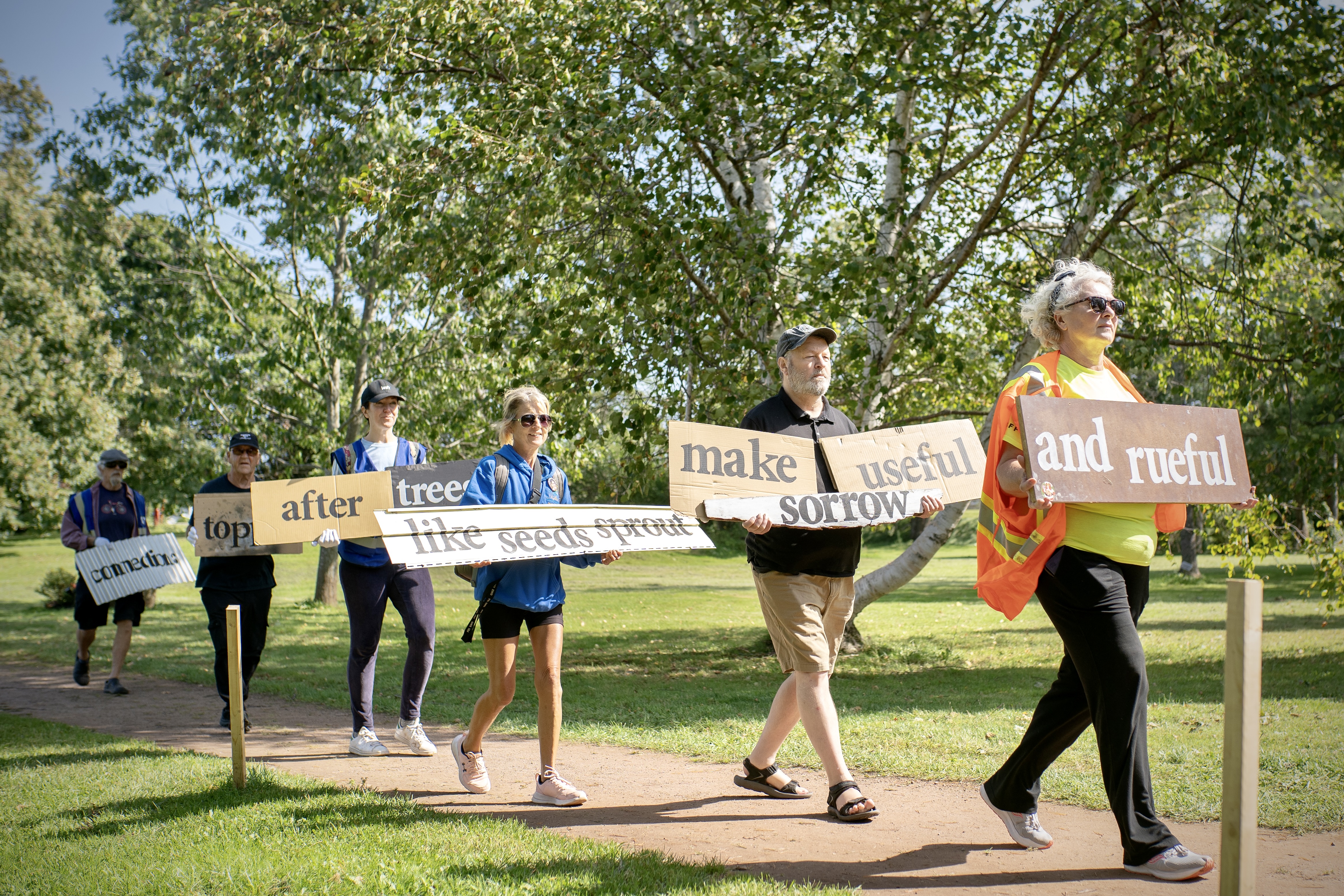 This event took place during Stratford, PEI’s Fall Fest event, supported by the Arts, Culture and Recreation Department. Participants who joined us, performed a newly created poem (created for the project) from PEI’s Poet Laureate – Tanya Davis. Walking with a variety of recycled debris with the poem text painted clearly, the style of performance draws from acknowledging the ongoing efforts of environmental sustainability on the anniversary of the devastation caused by hurricane Fiona.