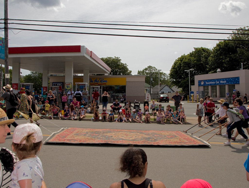 Fabricated during a 2 week long exhibition at Anna Leonowens Gallery, the structure of the work is a 10′ x 16.5′ rolling carpet with brooms that are attached to a rolling chassis by cables. Installed in the 2016 Natal Day Parade in Dartmouth, NS, performers swept/pulled/pushed the carpet along the route under heavy labour. Additional performers gleaned the leftover debris.