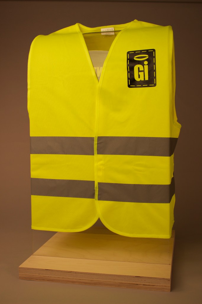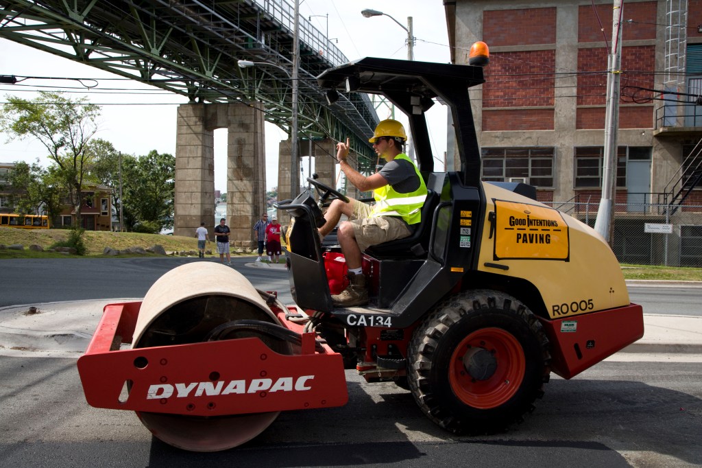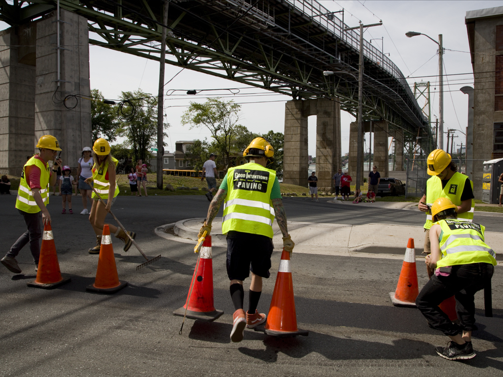 On exhibition during Fresh Paint/New Construction at Art Mûr, Montreal during July and August 2016, these specifically designed paving crew uniforms were worn by the volunteer crew during the 2016 Natal Day Parade. The performers worked with the machinery and hand tools of a road crew; things went awry as they attempted to maintain the civic infrastructure – taking measurements and flattening the pavement – despite their best efforts to do a good job.