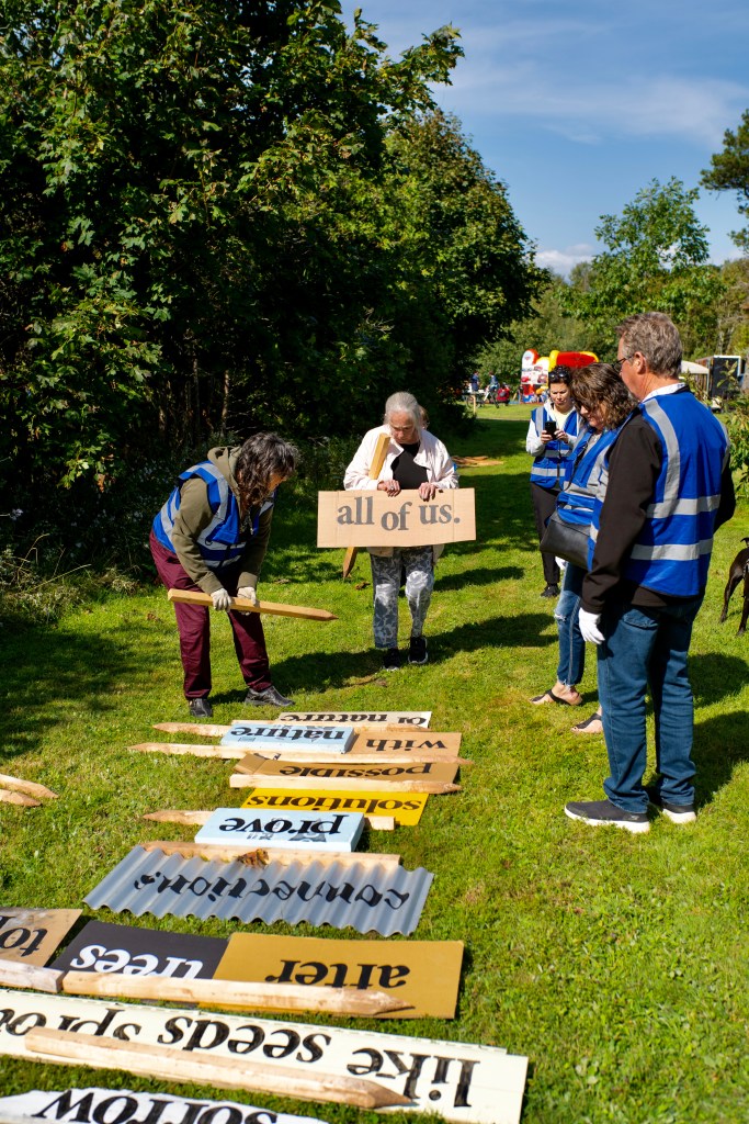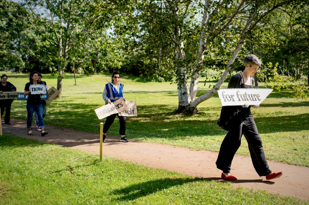 This event took place during Stratford, PEI’s Fall Fest event, supported by the Arts, Culture and Recreation Department. Participants who joined us, performed a newly created poem (created for the project) from PEI’s Poet Laureate – Tanya Davis. Walking with a variety of recycled debris with the poem text painted clearly, the style of performance draws from acknowledging the ongoing efforts of environmental sustainability on the anniversary of the devastation caused by hurricane Fiona.
